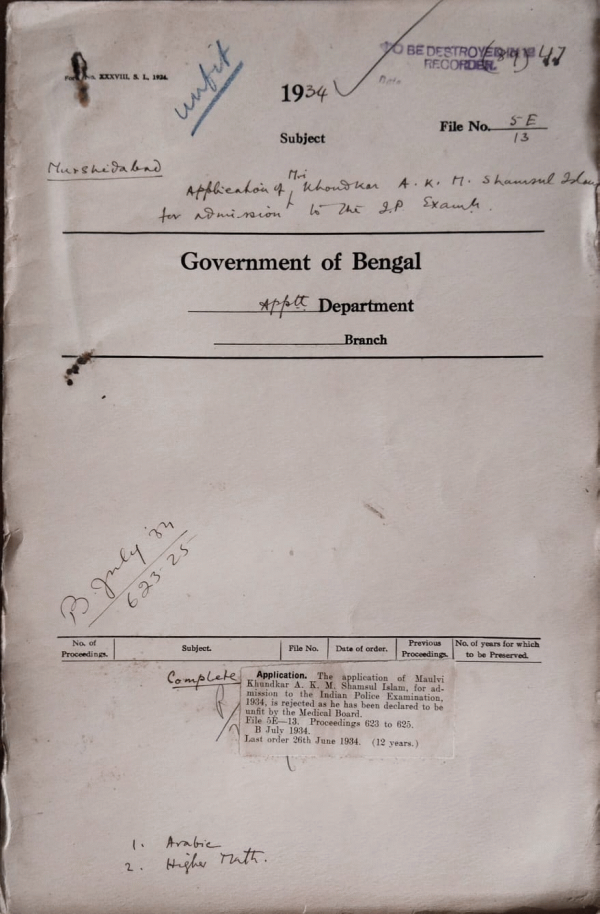 | Rack No. 2, Bundle No. 10, Sl No. 612 Application of P.K. Bardhan for admission to the Indian Police Exam. | Rack No. 2, Bundle No. 10, Sl No. 613 Application of Babu Ram Gopal Basak for admission to the Indian Police Exam. | Rack No. 2, Bundle No. 10, Sl No. 614 Application of Babu N.R. Mukharji for admission to the Indian Police Exam. | Rack No. 2, Bundle No. 10, Sl No. 615 Application of Maulvi A.K.M. Shamsul Islam for admission to the Indian Police Exam. | Rack No. 2, Bundle No. 10, Sl No. 616 Application of S.N. Das Gupta for admission to the Indian Police Exam. | Rack No. 2, Bundle No. 10, Sl No. 617 Application of Babu Niroj Chandra Haldar for admission to the Indian Police Exam. | Rack No. 2, Bundle No. 10, Sl No. 618 Application of Babu Sukumar Chaudhury for admission to the Indian Police Exam. |