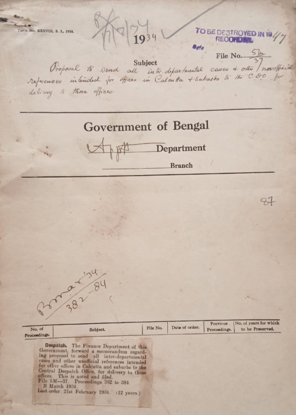 Proposal to send all inter-departmental cases and other unofficial references intended for other official issues in Calcutta and Suburbs to the central dispatch office.