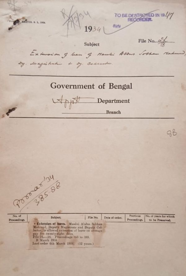| Rack No. 2, Bundle No. 05, Sl No. 285 Hot weather postings of Police Officers. | Rack No. 2, Bundle No. 05, Sl No. 286 Franchise qualifications for the land holder’s constituency of the Federal Lower house. | Rack No. 2, Bundle No. 05, Sl No. 287 Proposal to send all inter-departmental cases and other unofficial references intended for other official issues in Calcutta and Suburbs to the central dispatch office. | Rack No. 2, Bundle No. 05, Sl No. 288 Extension of leave of Maulvi Abdus Sobhar Mahmud Deputy Magistrate and Deputy Collector. | Rack No. 2, Bundle No. 05, Sl No. 289 Cancellation of leave Babu Badanya Kumar Roy Sub-Deputy Collection Chandpur Tippera. | Rack No. 2, Bundle No. 05, Sl No. 290 Appointment of Mr. K. Tolson A. Superintendentof Police as tools S.P. Chittagong. | Rack No. 2, Bundle No. 05, Sl No. 291 Confirmation of Mauvli Muhammad Keymuddin Ahmed Sub-Deputy Collector in the B.G.C.S. |
