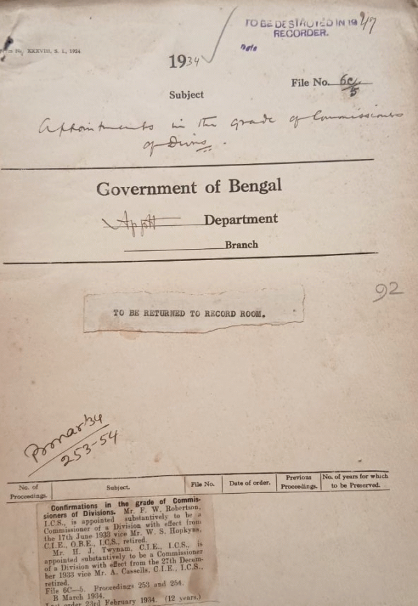 | Rack No. 2, Bundle No. 05, Sl No. 289 Cancellation of leave Babu Badanya Kumar Roy Sub-Deputy Collection Chandpur Tippera. | Rack No. 2, Bundle No. 05, Sl No. 290 Appointment of Mr. K. Tolson A. Superintendentof Police as tools S.P. Chittagong. | Rack No. 2, Bundle No. 05, Sl No. 291 Confirmation of Mauvli Muhammad Keymuddin Ahmed Sub-Deputy Collector in the B.G.C.S. | Rack No. 2, Bundle No. 05, Sl No. 292 Appointment in the grade of commissioners of divisions. | Rack No. 2, Bundle No. 05, Sl No. 293 Dismissal of Ata Muhammad Head Assistant Income Tax Department. | Rack No. 2, Bundle No. 05, Sl No. 294 Council questions by Raja Bahadur Bhurendra Narayan Singha the list of Scheduled costs. | Rack No. 2, Bundle No. 05, Sl No. 295 Budget Provision for the pay and allowance of the A.R.O. |