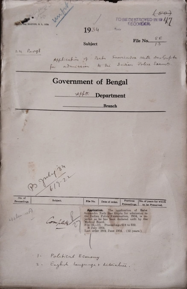 | Rack No. 2, Bundle No. 10, Sl No. 613 Application of Babu Ram Gopal Basak for admission to the Indian Police Exam. | Rack No. 2, Bundle No. 10, Sl No. 614 Application of Babu N.R. Mukharji for admission to the Indian Police Exam. | Rack No. 2, Bundle No. 10, Sl No. 615 Application of Maulvi A.K.M. Shamsul Islam for admission to the Indian Police Exam. | Rack No. 2, Bundle No. 10, Sl No. 616 Application of S.N. Das Gupta for admission to the Indian Police Exam. | Rack No. 2, Bundle No. 10, Sl No. 617 Application of Babu Niroj Chandra Haldar for admission to the Indian Police Exam. | Rack No. 2, Bundle No. 10, Sl No. 618 Application of Babu Sukumar Chaudhury for admission to the Indian Police Exam. | Rack No. 2, Bundle No. 10, Sl No. 619 Application of Babu Jatis Chandra Sen Gupta for admission to the Indian Police Exam. |