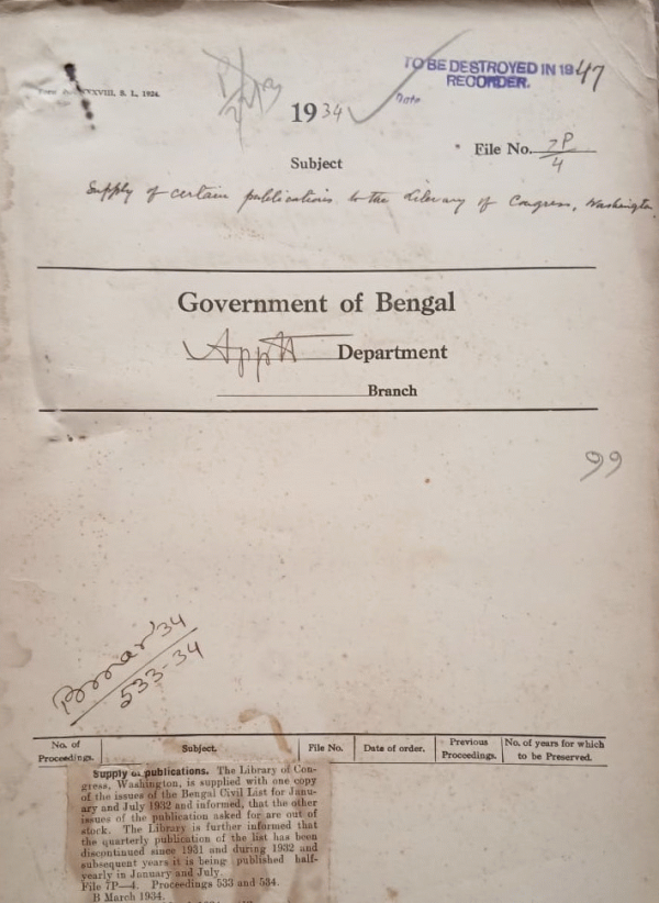 | Rack No. 2, Bundle No. 05, Sl No. 296 Revised estimates for 1933-34 and budget estimates 1934-35 under election for the Indian and provincial legislatures. | Rack No. 2, Bundle No. 05, Sl No. 297 Request of Babu Dhirendha Nath Mukherjee M.L.A. for supply of Bengal Civil list and Calcutta Gazette. | Rack No. 2, Bundle No. 05, Sl No. 298 Increasing allowance bill of Babu Jatindra Mohan Sub-Deputy Collector. | Rack No. 2, Bundle No. 05, Sl No. 299 Supply of certain publication of the library of congress, Washington. | Rack No. 2, Bundle No. 05, Sl No. 300 Distribution of the report of the Indian franchise committee. | Rack No. 2, Bundle No. 10, Sl No. 561 Request of the Rev. C.I. Pearson, Senior Cathedral Chaplain to permit of utilization of the balance at his credit in passage a/c to meet the cost of a passage by air. | Rack No. 2, Bundle No. 10, Sl No. 562 List of Assistant Session judges who are considered by the High Court to act as Additional District Judges. |