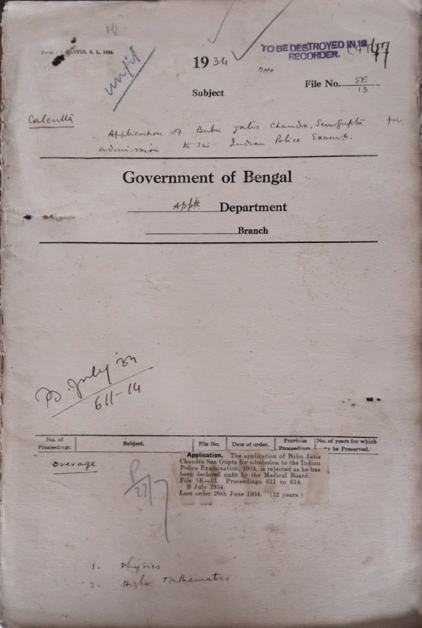 | Rack No. 2, Bundle No. 10, Sl No. 616 Application of S.N. Das Gupta for admission to the Indian Police Exam. | Rack No. 2, Bundle No. 10, Sl No. 617 Application of Babu Niroj Chandra Haldar for admission to the Indian Police Exam. | Rack No. 2, Bundle No. 10, Sl No. 618 Application of Babu Sukumar Chaudhury for admission to the Indian Police Exam. | Rack No. 2, Bundle No. 10, Sl No. 619 Application of Babu Jatis Chandra Sen Gupta for admission to the Indian Police Exam. | Rack No. 2, Bundle No. 10, Sl No. 620 Application of Babu S.C. Banarji for admission to the Indian Police Exam. | Rack No. 2, Bundle No. 10, Sl No. 621 Application of Maulvi Alimdad Khan for admission to the Indian Police Exam. | Rack No. 2, Bundle No. 10, Sl No. 622 Application of Babu Ranjit Kumar Sinha for admission to the Indian Police Exam. |