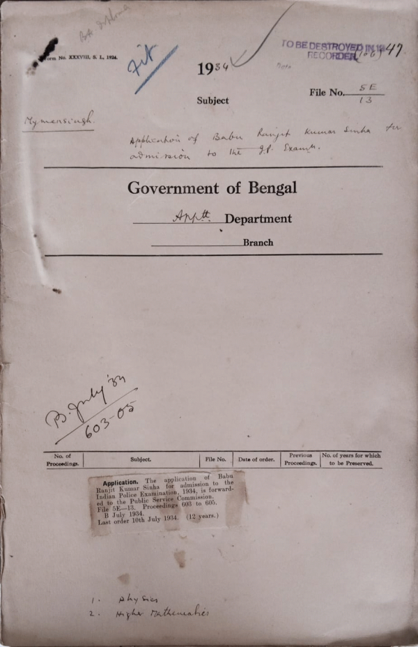 | Rack No. 2, Bundle No. 10, Sl No. 619 Application of Babu Jatis Chandra Sen Gupta for admission to the Indian Police Exam. | Rack No. 2, Bundle No. 10, Sl No. 620 Application of Babu S.C. Banarji for admission to the Indian Police Exam. | Rack No. 2, Bundle No. 10, Sl No. 621 Application of Maulvi Alimdad Khan for admission to the Indian Police Exam. | Rack No. 2, Bundle No. 10, Sl No. 622 Application of Babu Ranjit Kumar Sinha for admission to the Indian Police Exam. | Rack No. 2, Bundle No. 10, Sl No. 623 Application of Mualvi K.A.M. Halimuzzaman for admission to the Indian Police Exam. | Rack No. 2, Bundle No. 10, Sl No. 624 Application of Babu Debabrata Bandopadhay for admission to the Indian Police Exam. | Rack No. 2, Bundle No. 10, Sl No. 625 Application of Babu Bimal Chandra Gupta for admission to the Indian Police Exam. |