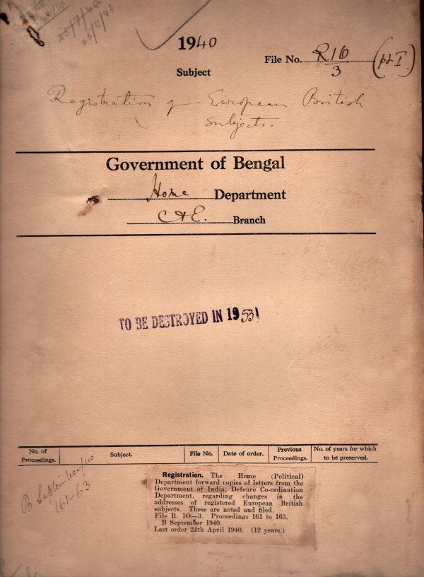| Rack No. 08, Bundle No. 15; SI No. 941 Application for inclusion of names in the current electoral rolls for the Chittagong Muhammadan Constituency of the B.L.C | Rack No. 08, Bundle No. 15; SI No. 942 Statement of grant or appropriation & expenditure under grant no 12 general Administrations (1939-40). | Rack No. 08, Bundle No. 15; SI No. 943 Supply to the govt. of India Department of Supply, of a Statement of the normal annual demands for all items of textiles & other goods of the Home Department. | Rack No. 08, Bundle No. 15; SI No. 944 Registration of European British Subjects. | Rack No. 08, Bundle No. 15; SI No. 945 Extension of the currency ordinance 1940 to the partially excluded areas of the Mymensingh District. | Rack No. 08, Bundle No. 15; SI No. 946 Extension of the excess Profits Tax Act, 1940 to the Partially Excluded areas in Bengal. | Rack No. 08, Bundle No. 15; SI No. 947 Extension of the Indian Coinage ordinance, 1940 to the partially excluded area in Bengal. |