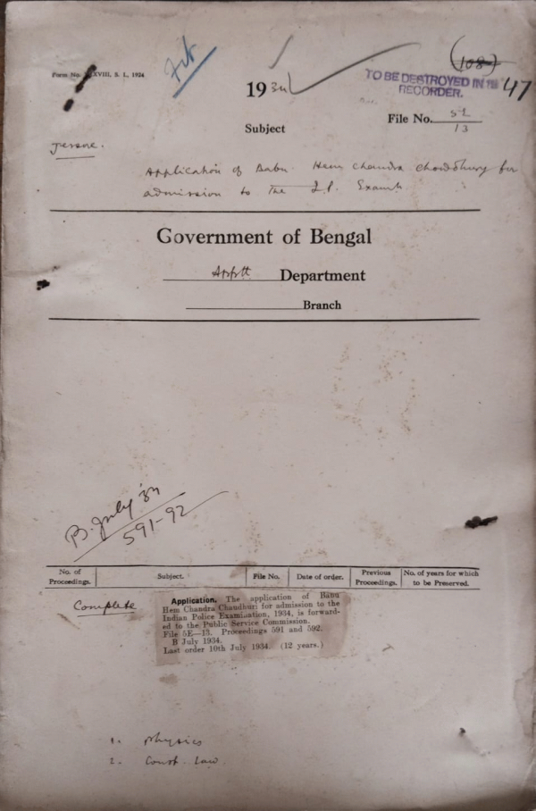 | Rack No. 2, Bundle No. 10, Sl No. 624 Application of Babu Debabrata Bandopadhay for admission to the Indian Police Exam. | Rack No. 2, Bundle No. 10, Sl No. 625 Application of Babu Bimal Chandra Gupta for admission to the Indian Police Exam. | Rack No. 2, Bundle No. 10, Sl No. 626 Application of Babu Himanshu Sekhar Basu for admission to the Indian Police Exam. | Rack No. 2, Bundle No. 10, Sl No. 627 Application of Babu Hem Chandra Chaudhuri for admission to the Indian Police Exam. | Rack No. 2, Bundle No. 10, Sl No. 628 Application of Maulvi Abdur Rashid for admission to the Indian Police Exam. | Rack No. 2, Bundle No. 10, Sl No. 629 Application of Babu Harbans Lall Bery for admission to the Indian Police Exam. | Rack No. 2, Bundle No. 10, Sl No. 630 Application of Maulvi Mirza Mohammad Amin for admission to the Indian Police Exam. |