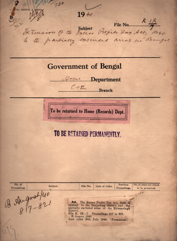 | Rack No. 08, Bundle No. 15; SI No. 943 Supply to the govt. of India Department of Supply, of a Statement of the normal annual demands for all items of textiles & other goods of the Home Department. | Rack No. 08, Bundle No. 15; SI No. 944 Registration of European British Subjects. | Rack No. 08, Bundle No. 15; SI No. 945 Extension of the currency ordinance 1940 to the partially excluded areas of the Mymensingh District. | Rack No. 08, Bundle No. 15; SI No. 946 Extension of the excess Profits Tax Act, 1940 to the Partially Excluded areas in Bengal. | Rack No. 08, Bundle No. 15; SI No. 947 Extension of the Indian Coinage ordinance, 1940 to the partially excluded area in Bengal. | Rack No. 08, Bundle No. 15; SI No. 948 Non-Official Bills in the Assembly & the Council | Rack No. 08, Bundle No. 15; SI No. 949 Change of address of the I.L.A. Department. |