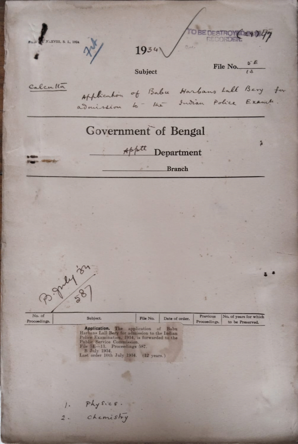 | Rack No. 2, Bundle No. 10, Sl No. 626 Application of Babu Himanshu Sekhar Basu for admission to the Indian Police Exam. | Rack No. 2, Bundle No. 10, Sl No. 627 Application of Babu Hem Chandra Chaudhuri for admission to the Indian Police Exam. | Rack No. 2, Bundle No. 10, Sl No. 628 Application of Maulvi Abdur Rashid for admission to the Indian Police Exam. | Rack No. 2, Bundle No. 10, Sl No. 629 Application of Babu Harbans Lall Bery for admission to the Indian Police Exam. | Rack No. 2, Bundle No. 10, Sl No. 630 Application of Maulvi Mirza Mohammad Amin for admission to the Indian Police Exam. | Rack No. 2, Bundle No. 10, Sl No. 631 Application of Babu P.K. Sen for admission to the Indian Police Exam. | Rack No. 2, Bundle No. 10, Sl No. 632 Application of Jatindra Nath Mukharji for admission to the Indian Police Exam. |