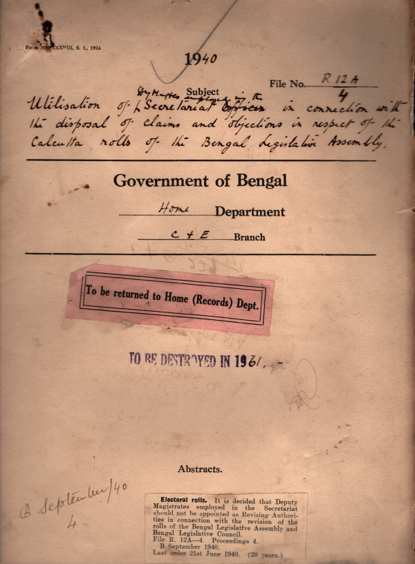 | Rack No. 08, Bundle No. 15; SI No. 950 Installation of a telephone in room no-3, 2nd floor, writers Building, allotted to the Parliamentary Secretary. | Rack No. 08, Bundle No. 15; SI No. 951 Amendments to the Bengal Public Service Commission Regulations. | Rack No. 08, Bundle No. 15; SI No. 952 Amendments to electoral roll European Constituency of central Legislative Assembly by inclusion of name of Mr. C.P. Lawson. | Rack No. 08, Bundle No. 15; SI No. 953 Disposal of claims & objections in respect of the Calcutta rolls of the B.L.A. & B.L.C. | Rack No. 08, Bundle No. 15; SI No. 954 Proposal that the personnel of the select committee on any govt. Bill. Before the legislature should be selected in consultation with the govt. Chief Whip. | Rack No. 08, Bundle No. 15; SI No. 955 Proposed amendment of Schedule I to the Rules of Business. | Rack No. 08, Bundle No. 15; SI No. 956 Payment of Conveyance allowance to the Revising Authorities. |