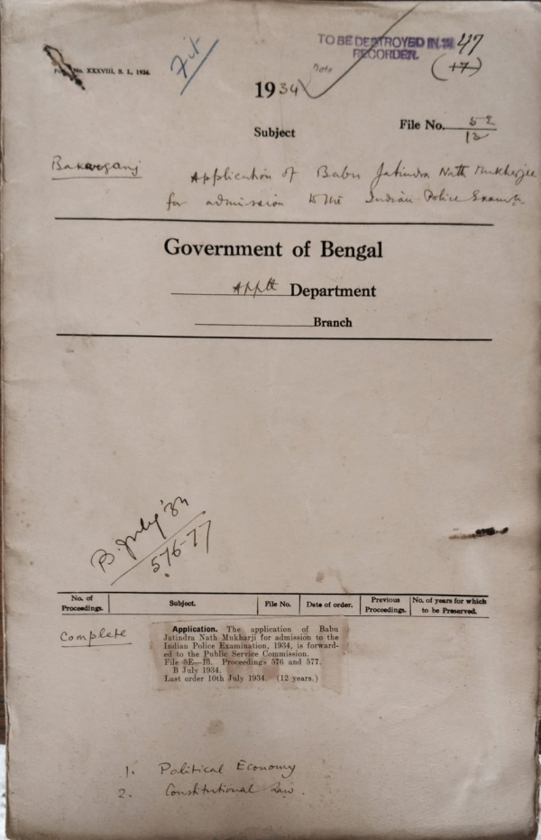 | Rack No. 2, Bundle No. 10, Sl No. 629 Application of Babu Harbans Lall Bery for admission to the Indian Police Exam. | Rack No. 2, Bundle No. 10, Sl No. 630 Application of Maulvi Mirza Mohammad Amin for admission to the Indian Police Exam. | Rack No. 2, Bundle No. 10, Sl No. 631 Application of Babu P.K. Sen for admission to the Indian Police Exam. | Rack No. 2, Bundle No. 10, Sl No. 632 Application of Jatindra Nath Mukharji for admission to the Indian Police Exam. | Rack No. 2, Bundle No. 10, Sl No. 633 Extension of the Period of an Insurance Police whose premium has been Paid from the I.C.S. Provident Fund. | Rack No. 2, Bundle No. 10, Sl No. 634 Question of consulting the European Government servants Association (Bengal) on the Subject of utilization on of provident Fund. | Rack No. 2, Bundle No. 10, Sl No. 635 Request of Babu P.C. Gope, Sub-Deputy Collector, for assistance in recovering the loan from B.J.C.S. Co-operative Bank, Dacca. |