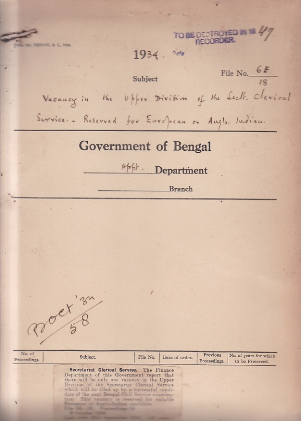 Vacancy in the upper Division of the Sec. Clerical Service Preserved for European.