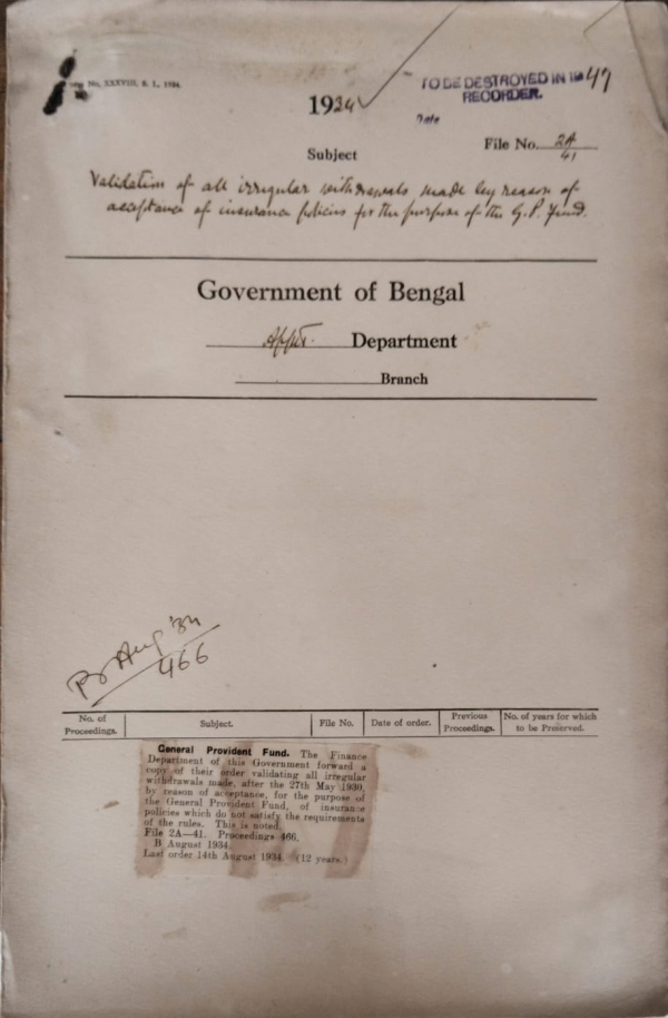 | Rack No. 2, Bundle No. 10, Sl No. 638 Liability of Lt. E.W.H. Worral A.D.C. to H.E. the governor for the cost of his successor's par rage to India. | Rack No. 2, Bundle No. 10, Sl No. 639 Bye election in the Bakarganj South (Muhammadan) Constituency of the B.L.C. in the place of the Honorable Khwaja Sir Nazimuddin, K.C.I.E. | Rack No. 2, Bundle No. 10, Sl No. 640 First class powers of Babu Kalipada Sen, Deputy Magistrate, Bakarganj. | Rack No. 2, Bundle No. 10, Sl No. 641 Validation of all irregular with-drawls made by reason of acceptance for the purpose of the G.P. Fund | Rack No. 2, Bundle No. 10, Sl No. 642 Return of military officers in Civil employ for the quarter ending 30-6-34. | Rack No. 2, Bundle No. 10, Sl No. 643 Allotment of grant in connection with the Indian Police Exam, 1934. | Rack No. 2, Bundle No. 10, Sl No. 644 Application of Babu Jatindra Mahan Chakrabarti, S.D.C., Rajshahi for an advance from G.P. Fund. |