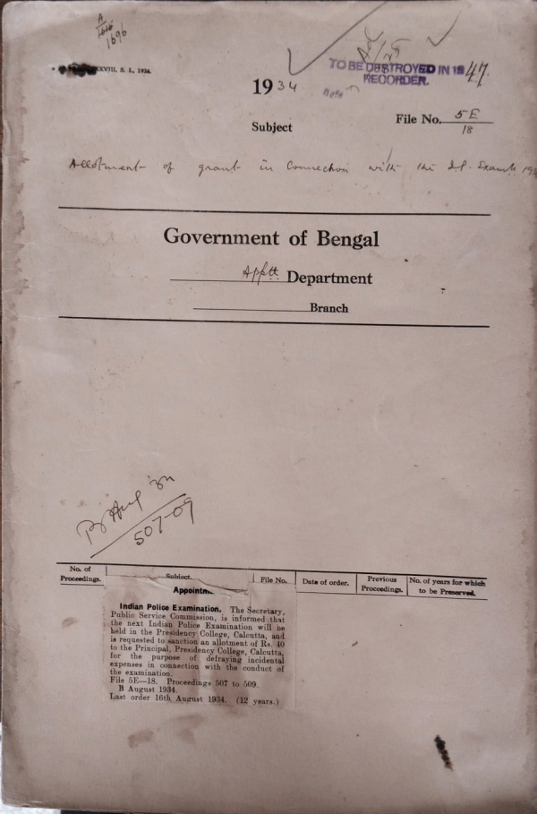 | Rack No. 2, Bundle No. 10, Sl No. 640 First class powers of Babu Kalipada Sen, Deputy Magistrate, Bakarganj. | Rack No. 2, Bundle No. 10, Sl No. 641 Validation of all irregular with-drawls made by reason of acceptance for the purpose of the G.P. Fund | Rack No. 2, Bundle No. 10, Sl No. 642 Return of military officers in Civil employ for the quarter ending 30-6-34. | Rack No. 2, Bundle No. 10, Sl No. 643 Allotment of grant in connection with the Indian Police Exam, 1934. | Rack No. 2, Bundle No. 10, Sl No. 644 Application of Babu Jatindra Mahan Chakrabarti, S.D.C., Rajshahi for an advance from G.P. Fund. | Rack No. 2, Bundle No. 10, Sl No. 645 T.A. of Babu Madhusudan Manda, S.D.C., Bangaon while employed as Circle officer, Mahespur | Rack No. 2, Bundle No. 10, Sl No. 646 Passage arrangement for Mr. B.R. Sen, I.C.S., D.S. Political + Appointment |