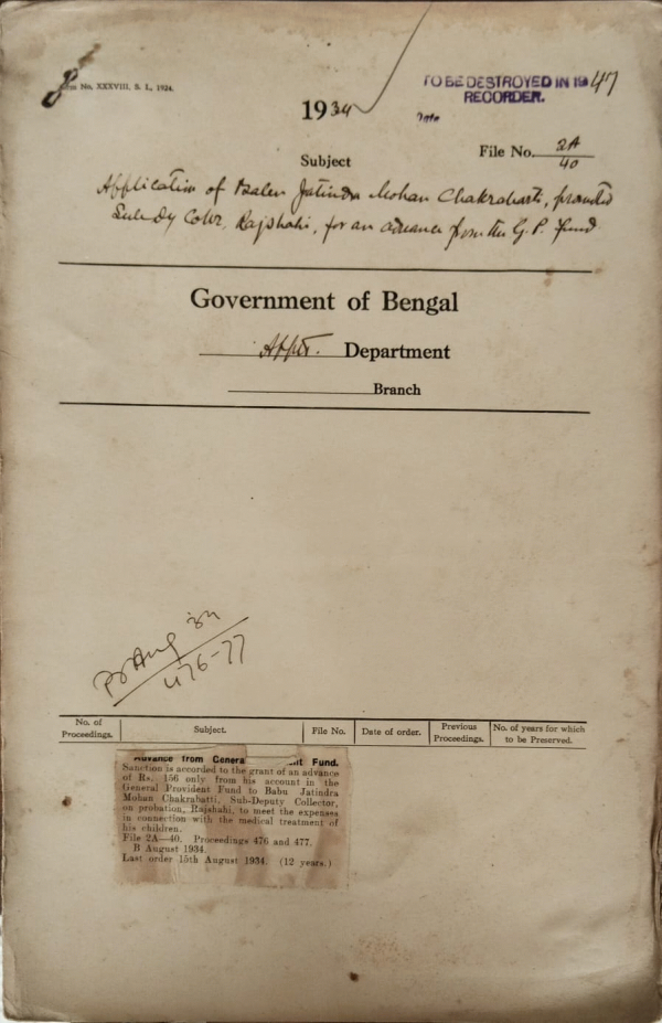 Application of Babu Jatindra Mahan Chakrabarti, S.D.C., Rajshahi for an advance from G.P. Fund.