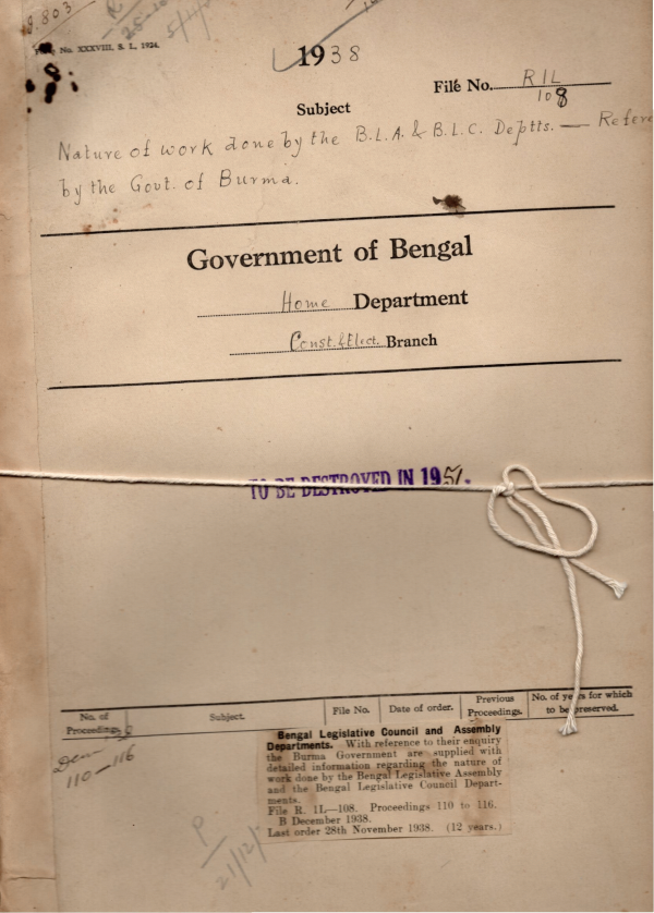 | Rack No. 08, Bundle No. 08, SI No. 464 Statement showing the total number of Votes obtained by parties in Contested constitutions of the B.L.A. | Rack No. 08, Bundle No. 08, SI No. 465 Percentage of Voters of each community on the final electoral rolls of each District. | Rack No. 08, Bundle No. 08, SI No. 466 Analysis of voting in the general constitutions in which seats a preserved for scheduled castes. | Rack No. 08, Bundle No. 08, SI No. 467 Nature of work done by the B. L. A. & B.L.C. Departments Reference by the Govt. of Burma. | Rack No. 08, Bundle No. 08, SI No. 468 C.Q. by Rai Bahadur Satish Chandra Mukherjee, M.L.C. regarding re-appointment of retired govt. servants to posts under the govt. of Bengal. | Rack No. 08, Bundle No. 08, SI No. 469 Procedure for acceptance of resignation by members of the provincial legislature. | Rack No. 08, Bundle No. 08, SI No. 470 Estimate of Voters under the Union Board Adult Franchise Scheme. |