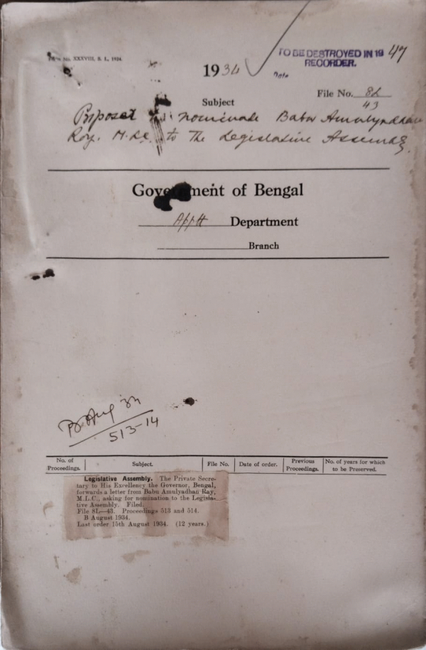 | Rack No. 2, Bundle No. 10, Sl No. 644 Application of Babu Jatindra Mahan Chakrabarti, S.D.C., Rajshahi for an advance from G.P. Fund. | Rack No. 2, Bundle No. 10, Sl No. 645 T.A. of Babu Madhusudan Manda, S.D.C., Bangaon while employed as Circle officer, Mahespur | Rack No. 2, Bundle No. 10, Sl No. 646 Passage arrangement for Mr. B.R. Sen, I.C.S., D.S. Political + Appointment | Rack No. 2, Bundle No. 10, Sl No. 647 Proposal for nomination for Babu Amulyadhan Roy, M.L.C. to the Legislative Assembly. | Rack No. 2, Bundle No. 10, Sl No. 648 Establishment of a temporary clerk in the Hooghly Collectorate for preparation of electoral rolls of the Legislative Assembly. | Rack No. 2, Bundle No. 10, Sl No. 649 Publication of advertisement in the Civil list. | Rack No. 2, Bundle No. 10, Sl No. 650 Appointment of Mr. C.A. Shillong, an inspector of the Calcutta Police to act as an Assistant Commr. Vice Babu Saktipada Chakrabarti. |