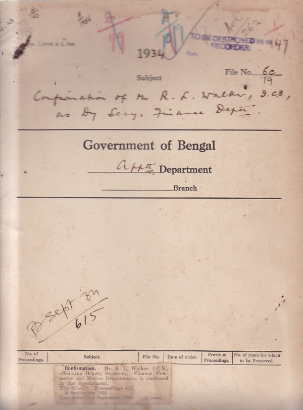 | Rack No. 02, Bundle No. 16, Sl No. 980 Babu Gadadhar Singh Ray, Sub-Deputy Collectors, is posted to the Burdwan Division, on being relieved of his duties as cases revaluation officer, Birbhum. | Rack No. 02, Bundle No. 16, Sl No. 981 Retirement of Babu Phanilal Mukharji, Sub- D. Collector. | Rack No. 02, Bundle No. 16, Sl No. 982 Communication of the reasons for re-appropriation under "37 Misc. Department Exams" for 1933-34. | Rack No. 02, Bundle No. 16, Sl No. 983 Confirmation of Mr. R.L. Walker, I.C.S. as Deputy Secretary Finance Department. | Rack No. 02, Bundle No. 16, Sl No. 984 Cancellation of unexpired portion of leave and posting of Babu Jatindra Mohon Das, Deputy Collector. | Rack No. 02, Bundle No. 16, Sl No. 985 Death report of Babu Jatindra Nath Chakrabarti, Sub-Deputy Collector Arambagh, Hooghly Payment of his accumulations in the G.P. Fund and arrear pay. | Rack No. 02, Bundle No. 16, Sl No. 986 Domicile of Anglo Indian Candidates for employment to provincial Services. |