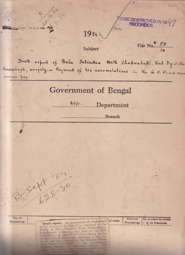 Death report of Babu Jatindra Nath Chakrabarti, Sub-Deputy Collector Arambagh, Hooghly Payment of his accumulations in the G.P. Fund and arrear pay.