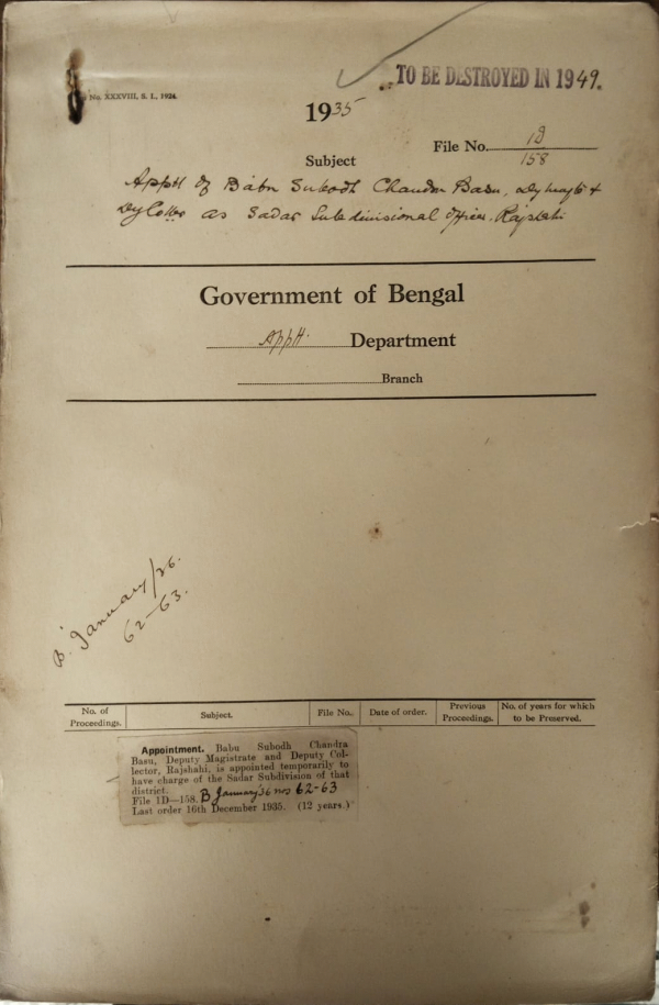 Appointment of Babu Subodh Chandra Deputy Sadar Sub-Divisional Officer Rajshahi.