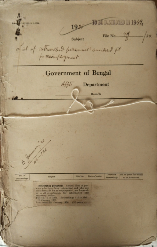 | Rack No. 2, Bundle No. 26, Sl No. 1516 Passage of Chaplains and their wives and Children. | Rack No. 2, Bundle No. 26, Sl No. 1517 Appointment of Babu Subodh Chandra Deputy Sadar Sub-Divisional Officer Rajshahi. | Rack No. 2, Bundle No. 26, Sl No. 1518 Subject for discussion at the Commissioners conference in Darjeeling on the Cue of the Puja Holidays. | Rack No. 2, Bundle No. 26, Sl No. 1519 List of Retrenched personnel considered fit for re-employment. | Rack No. 2, Bundle No. 26, Sl No. 1520 Reversion of Babu Bir Chandra Mukherjee Sub-Deputy Collector to general duties offers being relieved of his special duties access Revaluation Officer, Chittagong. | Rack No. 2, Bundle No. 26, Sl No. 1521 Application of Babu Santosh Chandra Mukharji for admission to the I.P. Examination. | Rack No. 2, Bundle No. 26, Sl No. 1523 Application of Babu Sailendra Nath Ghosal for admission to the I.P. Examination. |