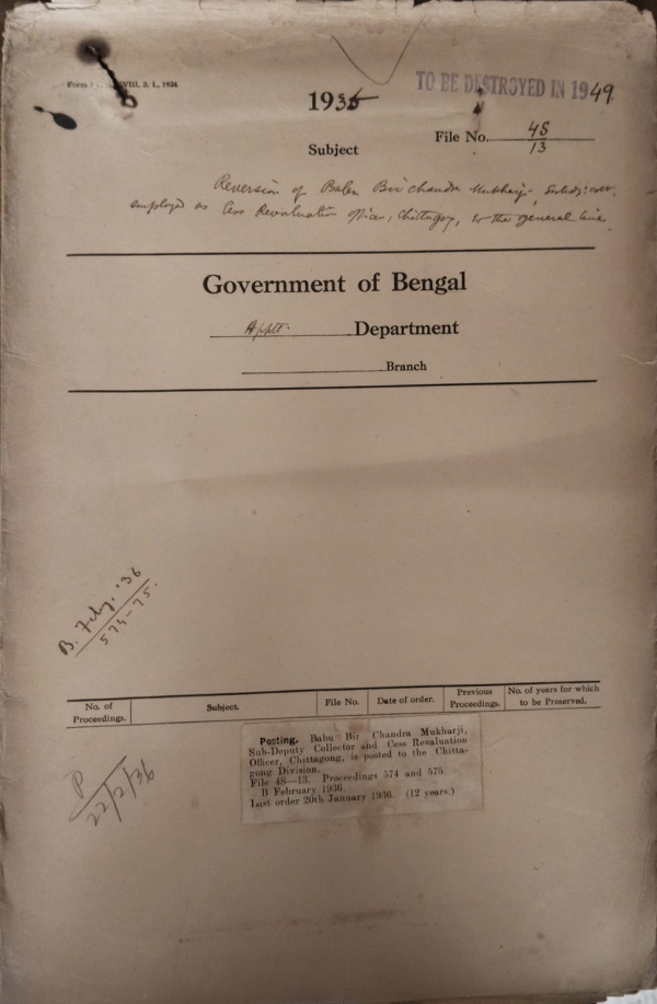 Reversion of Babu Bir Chandra Mukherjee Sub-Deputy Collector to general duties offers being relieved of his special duties access Revaluation Officer, Chittagong.