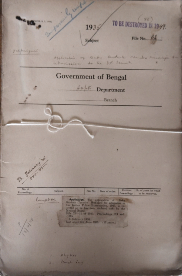 | Rack No. 2, Bundle No. 26, Sl No. 1518 Subject for discussion at the Commissioners conference in Darjeeling on the Cue of the Puja Holidays. | Rack No. 2, Bundle No. 26, Sl No. 1519 List of Retrenched personnel considered fit for re-employment. | Rack No. 2, Bundle No. 26, Sl No. 1520 Reversion of Babu Bir Chandra Mukherjee Sub-Deputy Collector to general duties offers being relieved of his special duties access Revaluation Officer, Chittagong. | Rack No. 2, Bundle No. 26, Sl No. 1521 Application of Babu Santosh Chandra Mukharji for admission to the I.P. Examination. | Rack No. 2, Bundle No. 26, Sl No. 1523 Application of Babu Sailendra Nath Ghosal for admission to the I.P. Examination. | Rack No. 2, Bundle No. 26, Sl No. 1524 Defalcation in the Howrah Collectorate. | Rack No. 2, Bundle No. 26, Sl No. 1525 Posting of I.C.S. officers (Executive) lecture December 1935 and the end of July 1936. |