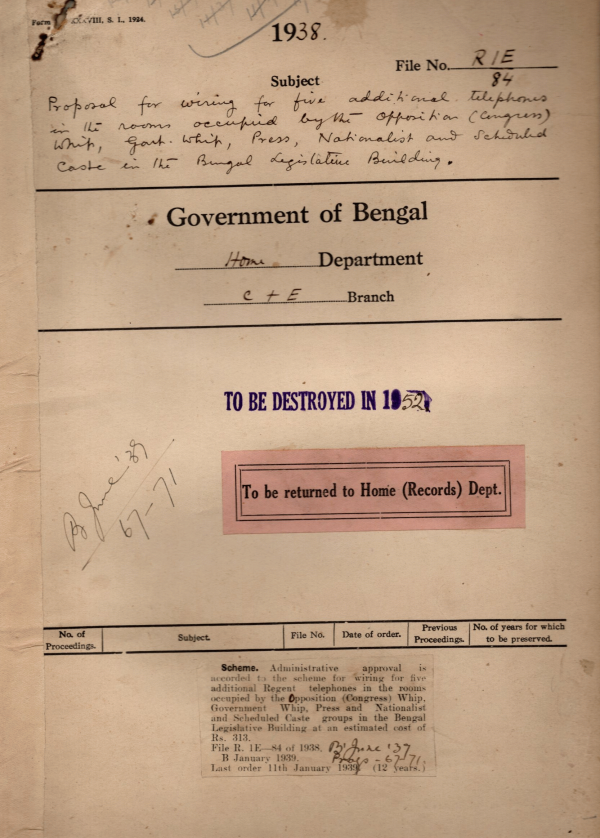 Proposal for wiring for five additional telephones in the rooms occupied by the opposition whip, govt. whip, press, Nationalist and Scheduled caste in the Bengal Legislative Building.