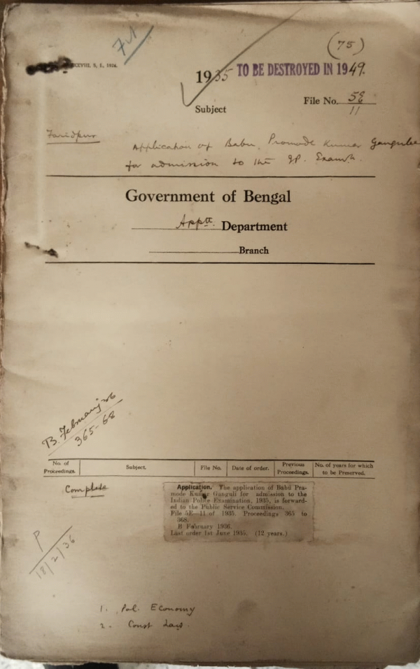 | Rack No. 2, Bundle No. 26, Sl No. 1523 Application of Babu Sailendra Nath Ghosal for admission to the I.P. Examination. | Rack No. 2, Bundle No. 26, Sl No. 1524 Defalcation in the Howrah Collectorate. | Rack No. 2, Bundle No. 26, Sl No. 1525 Posting of I.C.S. officers (Executive) lecture December 1935 and the end of July 1936. | Rack No. 2, Bundle No. 26, Sl No. 1526 Application of Babu Pramode Kumar Ganguli for admission to the I.P. Examination. | Rack No. 2, Bundle No. 26, Sl No. 1527 Application of Babu Haraprasad Chaterji for admission to the I.P. Examination. | Rack No. 2, Bundle No. 26, Sl No. 1528 Application of Babu Maulvi Mafizur Rahman for admission to the I.P. Examination. | Rack No. 2, Bundle No. 26, Sl No. 1529 Application of Babu Jamini Ranjan Das for admission to the I.P. Examination. |