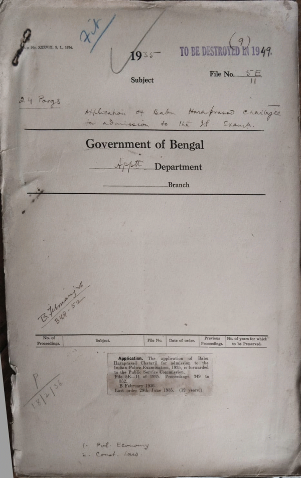 Application of Babu Haraprasad Chaterji for admission to the I.P. Examination.