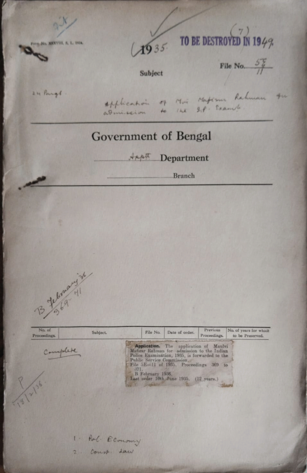 | Rack No. 2, Bundle No. 26, Sl No. 1525 Posting of I.C.S. officers (Executive) lecture December 1935 and the end of July 1936. | Rack No. 2, Bundle No. 26, Sl No. 1526 Application of Babu Pramode Kumar Ganguli for admission to the I.P. Examination. | Rack No. 2, Bundle No. 26, Sl No. 1527 Application of Babu Haraprasad Chaterji for admission to the I.P. Examination. | Rack No. 2, Bundle No. 26, Sl No. 1528 Application of Babu Maulvi Mafizur Rahman for admission to the I.P. Examination. | Rack No. 2, Bundle No. 26, Sl No. 1529 Application of Babu Jamini Ranjan Das for admission to the I.P. Examination. | Rack No. 2, Bundle No. 26, Sl No. 1530 Application of Babu Jibansu Mohan for admission to the I.P. Examination. | Rack No. 2, Bundle No. 26, Sl No. 1531 Application of Babu Rabindra Nath Chakrabarty for admission to the I.P. Examination. |