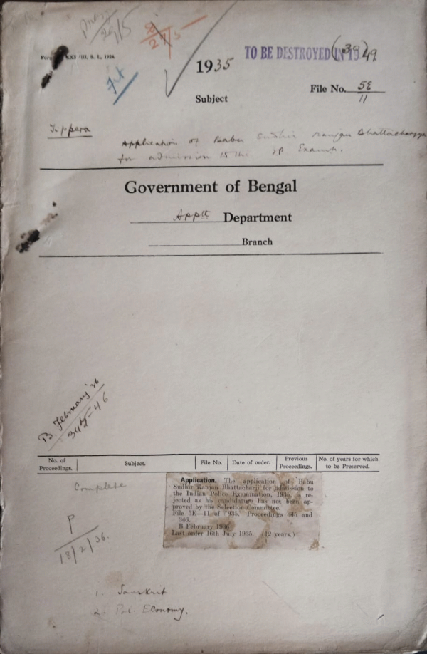 Application of Babu Sudhir Ranjan Bhattacherji for admission to the I.P. Examination.
