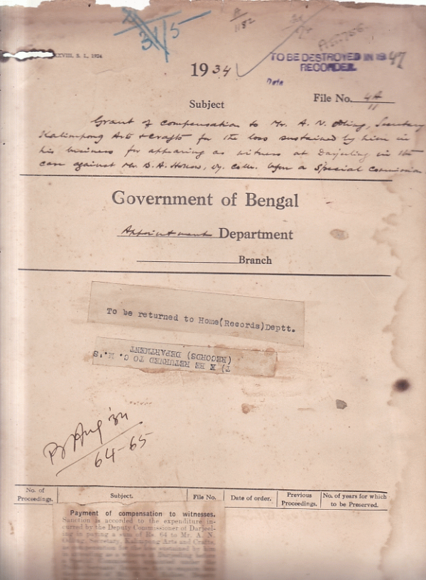 Grant of compensation to Mr. A.N. doling secretary Kalimpong Arts and Crafts for the loss sustained by him in attending as a witness at Darjeeling in the Conduct against Mr. B.A. Hallow Deputy Collector before a special commission.