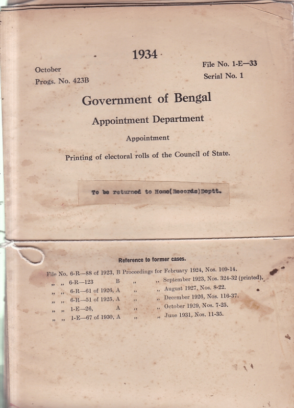 | Rack No. 02, Bundle No. 16, Sl No. 990 Bengali translation of white paper on Indian Constitutional Reform by Babu Nagendra Nath Chanda. | Rack No. 02, Bundle No. 17, Sl No. 1000 Employment of Mr. Maulvi Saleh Abdur Rahim Deputy Magistrate and Deputy Collector as Assistant Manager Dacca Nawab estate. | Rack No. 02, Bundle No. 17, Sl No. 1001 Posting of Deputy Magistrate and Deputy Collectors (September, 1934. | Rack No. 02, Bundle No. 17, Sl No. 1002 Printing of electoral rolls of the council of state. | Rack No. 02, Bundle No. 17, Sl No. 1003 Amendment of the Electoral Rules of the presidency and Burdwan European constituency of the Bengal legislative council. | Rack No. 02, Bundle No. 17, Sl No. 1004 Form of Notices required for draft publication of the electoral rolls of the legislative Assembly. | Rack No. 02, Bundle No. 17, Sl No. 1005 Grant of an advance from G.P. fund to Maulvi Nur Muhammad Chaudhuri Sub-Deputy Collector. |