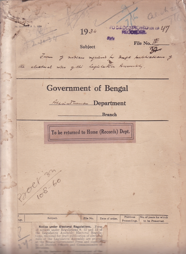 | Rack No. 02, Bundle No. 17, Sl No. 1001 Posting of Deputy Magistrate and Deputy Collectors (September, 1934. | Rack No. 02, Bundle No. 17, Sl No. 1002 Printing of electoral rolls of the council of state. | Rack No. 02, Bundle No. 17, Sl No. 1003 Amendment of the Electoral Rules of the presidency and Burdwan European constituency of the Bengal legislative council. | Rack No. 02, Bundle No. 17, Sl No. 1004 Form of Notices required for draft publication of the electoral rolls of the legislative Assembly. | Rack No. 02, Bundle No. 17, Sl No. 1005 Grant of an advance from G.P. fund to Maulvi Nur Muhammad Chaudhuri Sub-Deputy Collector. | Rack No. 02, Bundle No. 17, Sl No. 1006 Provision of a chemical fire Applications in the S.T. Thomas Church at Howrah. | Rack No. 02, Bundle No. 17, Sl No. 1007 Six Monthly estimates for 1934-35 (Central). |