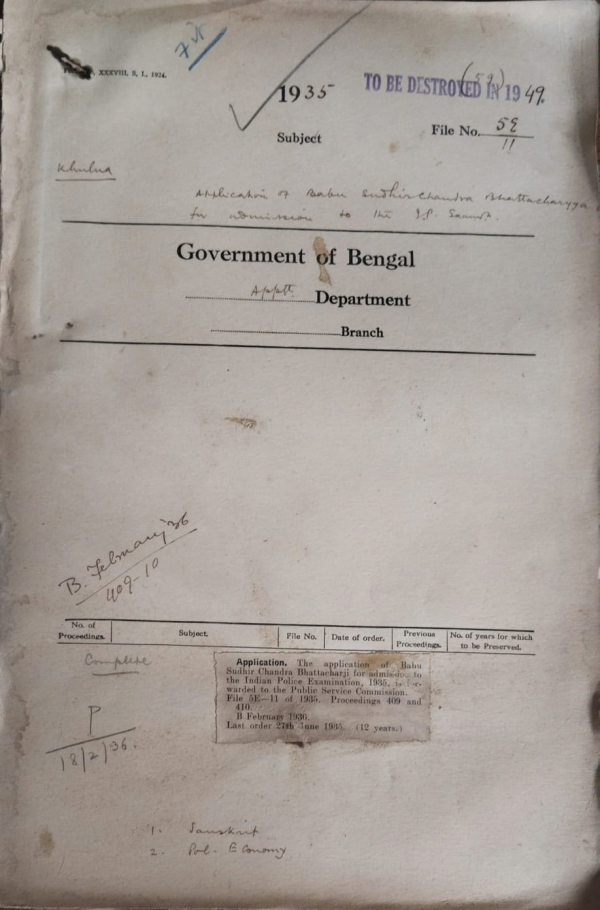 Application of Babu Sudhir Chandra Bhattachrji for admission to the I.P. Examination.