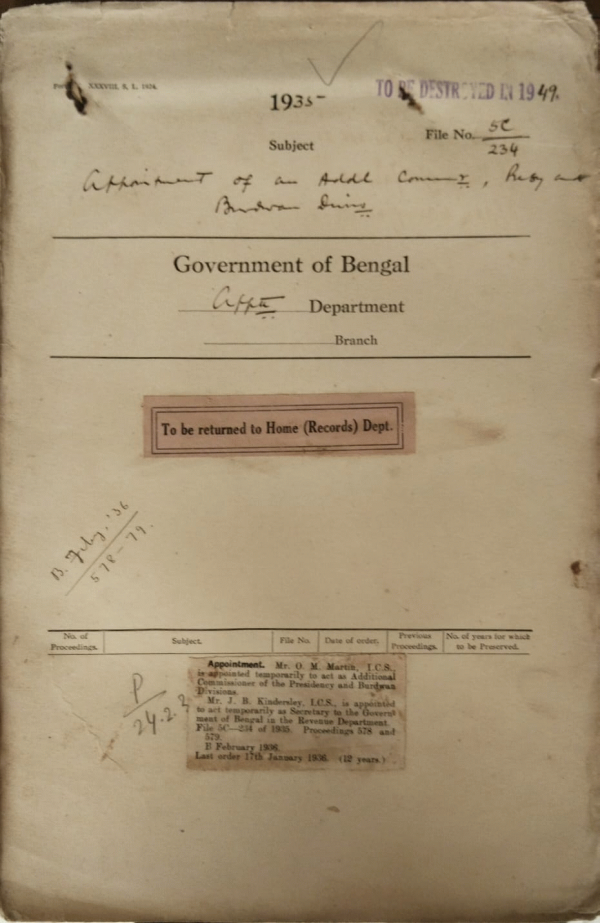 | Rack No. 2, Bundle No. 26, Sl No. 1554 Employment of Sub-Deputy Collectors Jute Propaganda work. | Rack No. 2, Bundle No. 26, Sl No. 1555 Employment of menials for the Indian Delimitation. | Rack No. 2, Bundle No. 26, Sl No. 1556 Summary powers of Babu Anil Chandra Bose, Deputy Magistrate Burdwan. | Rack No. 2, Bundle No. 26, Sl No. 1557 Application of widow of late Babu Sudhendu Kumar Das (Sub-Deputy Collector) for compassionate gratuity. | Rack No. 2, Bundle No. 26, Sl No. 1558 I.P. application of Babu Jnanendra Bhusan Chaudhury. | Rack No. 2, Bundle No. 26, Sl No. 1559 Requisition for Sub-Deputy Collectors in the Rajshahi Division. | Rack No. 2, Bundle No. 26, Sl No. 1560 Posting of Sub-Deputy Collectors during December 1935 and January 1936. |
