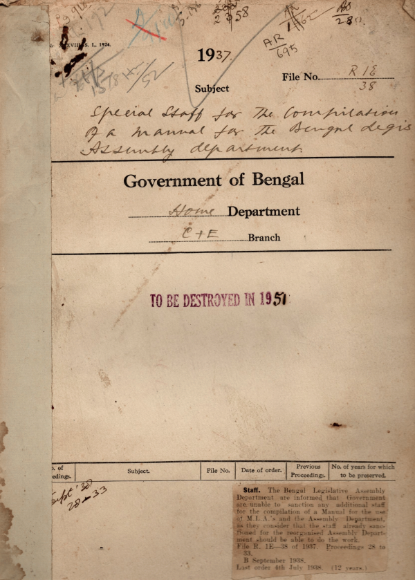 | Rack No. 08, Bundle No. 09, SI No. 515 Nomenclature of the Bengal Legislature Assembly + Bengal Legislative Council. | Rack No. 08, Bundle No. 09, SI No. 516 By Mr. S.C. Chakraverti M.L.C. regarding a separate house for the accommodation of the B.L.C. | Rack No. 08, Bundle No. 09, SI No. 517 Appointment of 1st and 2nd A.S. and Registrars B.L.A. temporarily. | Rack No. 08, Bundle No. 09, SI No. 518 Special staff for the compilation of a manual for the B.L.A. department. | Rack No. 08, Bundle No. 09, SI No. 519 Purchase of publication of the “Govt. of Indian Act, 1935” by N.R. Aiyangar. | Rack No. 08, Bundle No. 09, SI No. 520 Adjustment motion in the assembly by Mr. S.N. Biswas on hunger Strike. | Rack No. 08, Bundle No. 09, SI No. 521 Placing of grant of the disposal of the C.P.M., Calcutta for expenditure for the last general elections. |