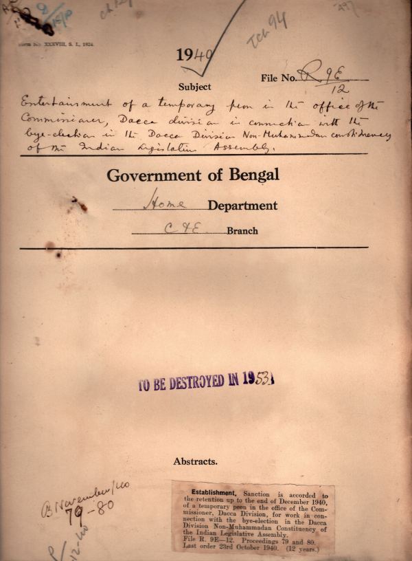 Establishment of a temporary peon in the office of the Commissioner, Dacca Division in connection with the bye election in the Dacca division in connection with the bye-election in the Dacca Non-Mohammadan Constituency of the Indian Legislative Assembly.