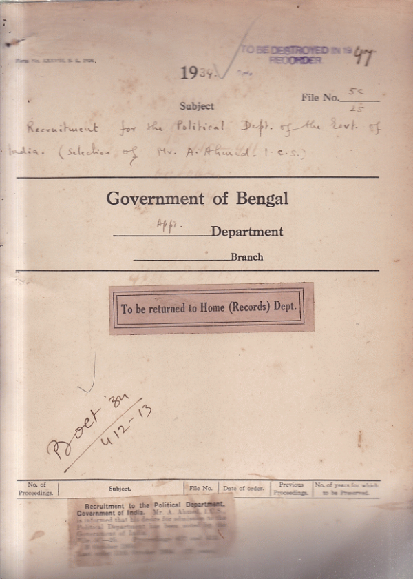 Recruitment for the Political Department of the Governmentof India (Selection of Mr. A. Ahmed I.C.S).