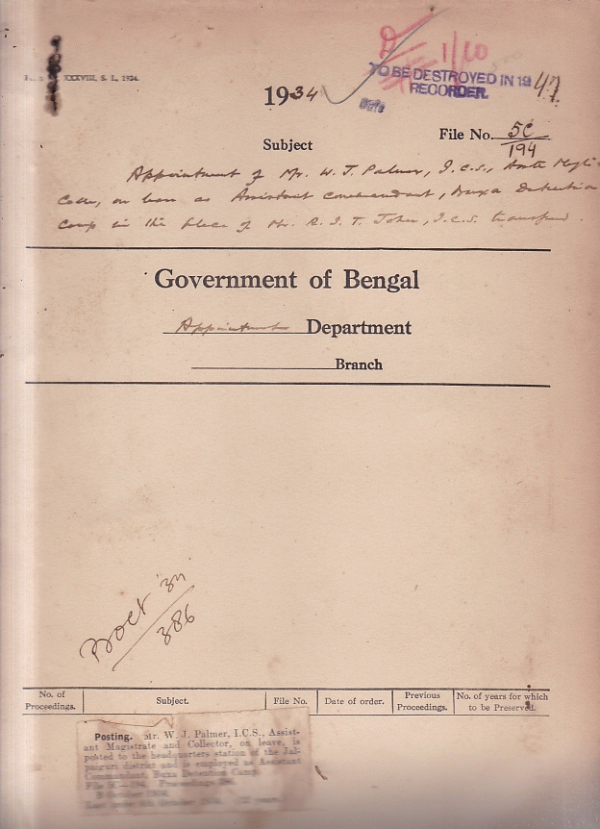 Appointment of Mr. W.J. Palmer I.C.S. Assistant Magistrate and Collector on leave as Assistant Commandant Buxa Detention Camp.