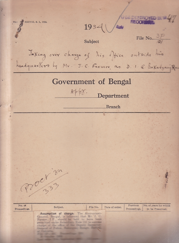 | Rack No. 02, Bundle No. 17, Sl No. 1029 Appointment of Lt. W.S.F. Hickie to act as A.D.C. on the personal staff of H.E. the personal staff of H.E. the | Rack No. 02, Bundle No. 17, Sl No. 1030 Appointment of Major C.G.O. Brennan as Additional S.P. Dacca. | Rack No. 02, Bundle No. 17, Sl No. 1031 Appointment of Babu Kamalesh purkait for admission to the I.C.S. Examination1935. | Rack No. 02, Bundle No. 17, Sl No. 1032 Taking over charge of his office outside his head quarters by Mr. J.C. Farmer, as D.I.G. Bakarganj Range. | Rack No. 02, Bundle No. 17, Sl No. 1033 Representation of the B.C.S. (Ex) Association regarding officiating prom6otion to the Selection grade of the B.C.S. (Ex). 89 | Rack No. 02, Bundle No. 17, Sl No. 1034 Performance of Journeys by a lower class for which travelling allowance in admissible. | Rack No. 02, Bundle No. 17, Sl No. 1035 List of Articles with which pro-cautionary Assistant Sepsis of Police Coming out to Bengal and Assam Should provide themselves. |