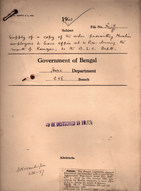 Supply of a Copy of the order permitting Muslim employees to leave office at 4 P.M. during Ramzan, to the B.L.C. Department.