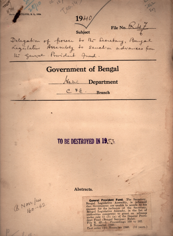 | Rack No. 08, Bundle No. 17; SI No. 1057 Refund of security deposit of Surendra Narayan Sinha a Candidate for election to the B.L.C. | Rack No. 08, Bundle No. 17; SI No. 1058 Disposal of Joint electoral rolls of the old B.L.C. & the I.L.A. | Rack No. 08, Bundle No. 17; SI No. 1059 Procedure for deductions from pay of pension on a/c. of contribution to the Bengal War Purposes Fund. | Rack No. 08, Bundle No. 17; SI No. 1060 Delegation of powers to the Sectary, B.L.A. to Sanction advances from the G.P. Fund. | Rack No. 08, Bundle No. 17; SI No. 1061 Extension of the Indian Coinage (2nd Amendment) Ordinance, 1940 to the Partially Excluded Areas in Bengal. | Rack No. 08, Bundle No. 17; SI No. 1062 Procedure for issuing Correction slips to Manuals. | Rack No. 08, Bundle No. 17; SI No. 1063 The Secretary to the governor of Bengal to be informed of visits to Calcutta by important officers of the Govt. of India. |