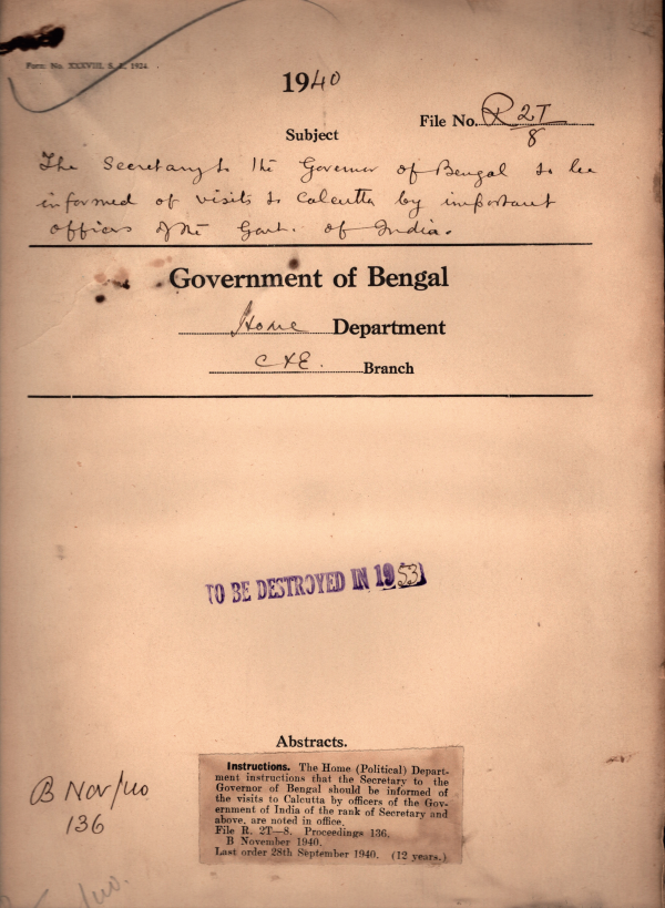 The Secretary to the governor of Bengal to be informed of visits to Calcutta by important officers of the Govt. of India.