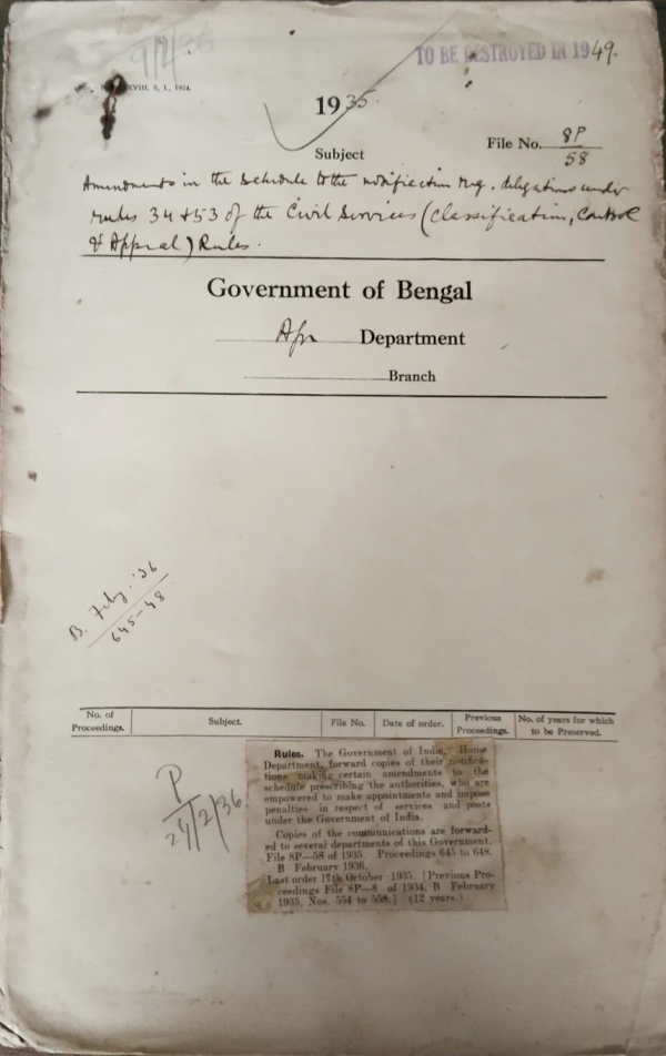 | Rack No. 2, Bundle No. 26, Sl No. 1568 Nomination of official member to the Bengal legislative Council. | Rack No. 2, Bundle No. 26, Sl No. 1569 Recovery of an advance granted to the Subscriber from the Sterling Branches of Provident funds. | Rack No. 2, Bundle No. 26, Sl No. 1570 Cancellation of the transfer of Maulvi Muhmud Ahmad Deputy Magistrate and Deputy .Collector to Tippera. | Rack No. 2, Bundle No. 27, Sl No. 1571 Amendment in the schedule to the notification regarding delegations under rules 34 & 53 of the civil services Rules. | Rack No. 2, Bundle No. 27, Sl No. 1572 Expenses at the Indian Delimitation on committee in connection with their visit in Bengal. | Rack No. 2, Bundle No. 27, Sl No. 1573 Arrangement for inclusion of names of drivers of motor vehicles paying licensee tees at the Bengal legislative Assemble under the reformed Constitution. | Rack No. 2, Bundle No. 27, Sl No. 1574 Arrear daily allowance of Mr. H.G. Wight .I.C.S. |