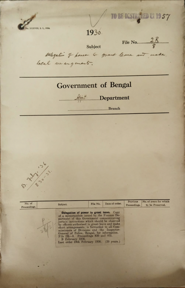 | Rack No. 2, Bundle No. 27, Sl No. 1581 Application of Babu Purenendu sekar mazumdar for administer to the Indian police examination. | Rack No. 2, Bundle No. 27, Sl No. 1582 Posting of Deputy Magistrate & Deputy collector in December 1935. | Rack No. 2, Bundle No. 27, Sl No. 1583 Debarring Mr. Belayet Ali mian and other from obtaining any appointment under Government. | Rack No. 2, Bundle No. 27, Sl No. 1584 Delegator of power to grant and make local arrangement. | Rack No. 2, Bundle No. 27, Sl No. 1585 Report of the birth of a daughter to Mr. H. Tusnell Barrett, I.C.S. District Magistrate Bakerganj. | Rack No. 2, Bundle No. 27, Sl No. 1586 Posting of Mr. D.S. Maxlet. I.P. | Rack No. 2, Bundle No. 27, Sl No. 1587 Requisition form Indian civil service officer. |