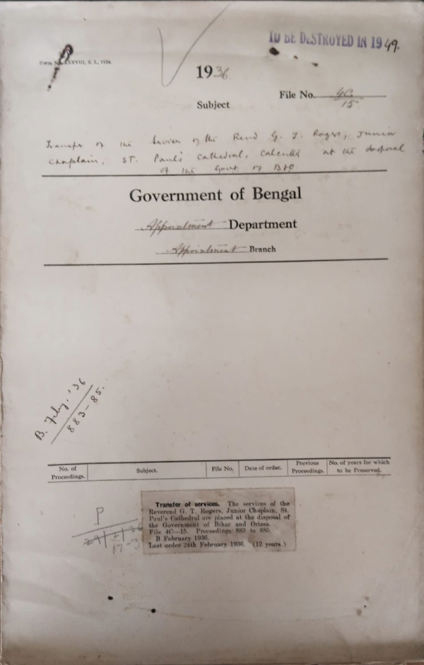 Transfer of the service of the Revt. G.T.Rogers, junior chaplain st. pauls cathedral are placed at the disposal of the government of Bihar and Orissa.