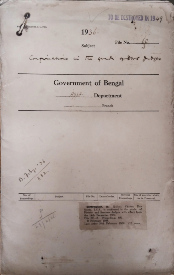 | Rack No. 2, Bundle No. 27, Sl No. 1587 Requisition form Indian civil service officer. | Rack No. 2, Bundle No. 27, Sl No. 1588 Indian civil service Examination 1935(london) | Rack No. 2, Bundle No. 27, Sl No. 1589 Transfer of the service of the Revt. G.T.Rogers, junior chaplain st. pauls cathedral are placed at the disposal of the government of Bihar and Orissa. | Rack No. 2, Bundle No. 27, Sl No. 1590 Configuration in the Grade of District & Session Judges. | Rack No. 2, Bundle No. 27, Sl No. 1591 Appointment of Rev. A.J. Pearson, Chaplain of Dinajpur to be chaplain of Dinajpur to be Chaplain of St. Stephens. | Rack No. 2, Bundle No. 27, Sl No. 1592 Confirmation of the Revd. T.B. Randolph as a Junior Chaplain. | Rack No. 2, Bundle No. 27, Sl No. 1593 Posting of transfer of certain Military intelligence officers as Additional Superintendent of Police. |