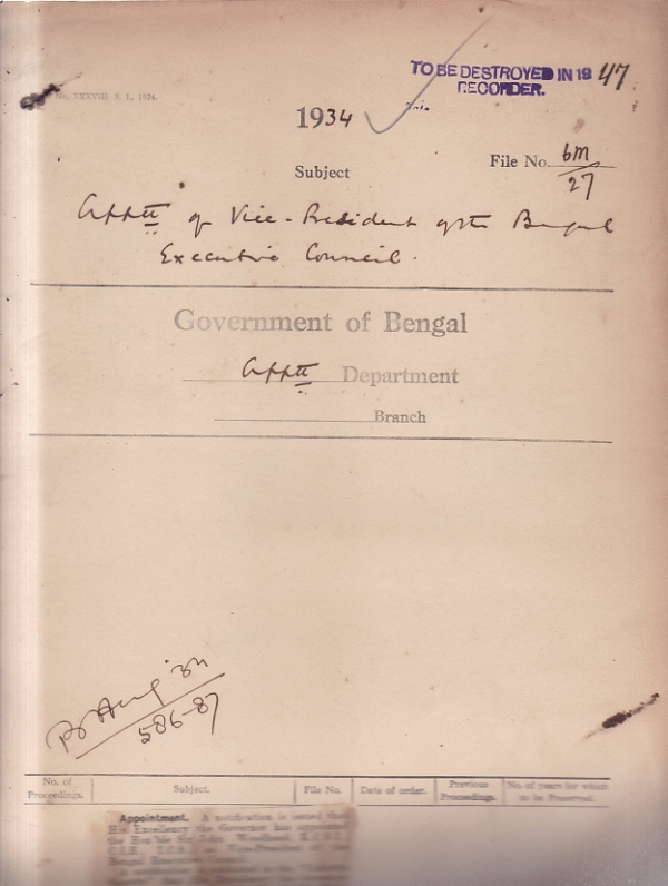 | Rack No. 02, Bundle No. 17, Sl No. 1045 Deputation of certain Assistant Sepsis of Police to Survey Settlement Camp Dinajpur. | Rack No. 02, Bundle No. 17, Sl No. 1046 Computation of the civil services (Classification control and appeal) Rules with Explanatory Notes by Rai Sahib Tara Chand. | Rack No. 02, Bundle No. 17, Sl No. 1047 Nomination of official members to the Bengal legislative council. | Rack No. 02, Bundle No. 17, Sl No. 1048 Appointment of vice-president of the Bengal Executive council. | Rack No. 02, Bundle No. 17, Sl No. 1049 Appointment of good work done by Rai. Sahib Sashi Bhusan Bhattachrje Deputy Magistrate and Deputy Collector Birbhum. | Rack No. 02, Bundle No. 17, Sl No. 1050 Application of Maulvi Abdul Karim (No. 1) Sub-Deputy Collector and circle officer, Sadar Mymensingh for an advance for the G.P Fund. | Rack No. 02, Bundle No. 17, Sl No. 991 Application of Babu Karali Charan Ganguli, Deputy Magistrate And Deputy Collector for the post of Revenue officer Cooch Behar State. |