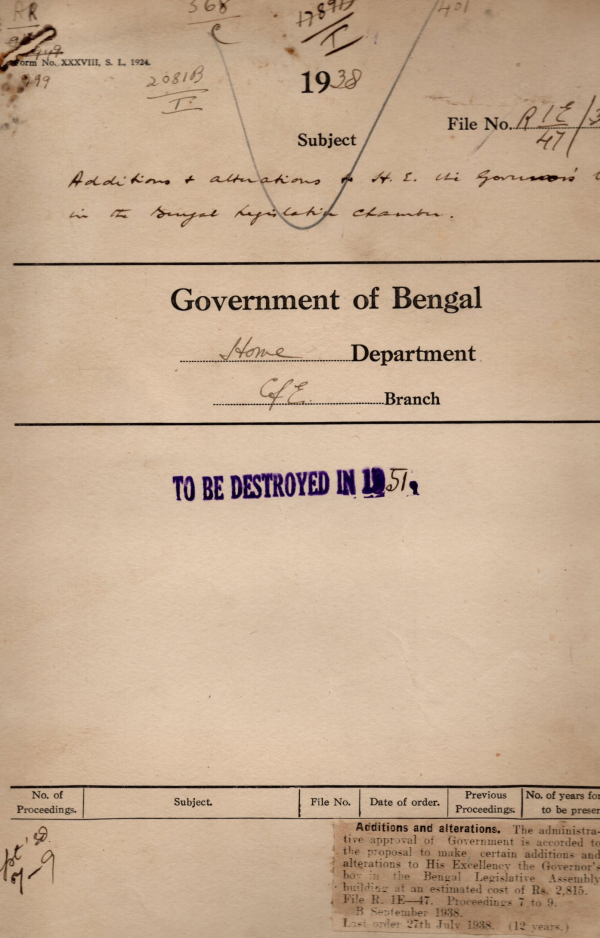 | Rack No. 08, Bundle No. 09, SI No. 555 Form of Weekly Pending list of Assembly Questions. | Rack No. 08, Bundle No. 09, SI No. 556 Installation of admiralty type Watertight Plugs. | Rack No. 08, Bundle No. 09, SI No. 557 Installation of a bracket light over the Co-ordination allotted to the duties in the First Building. | Rack No. 08, Bundle No. 09, SI No. 558 Additions and alterations to his Excellency in the governor’s boy in the B.L.A. | Rack No. 08, Bundle No. 09, SI No. 559 Notification in the gazette of India of grant leave to, or, the acting appointment of governor. | Rack No. 08, Bundle No. 09, SI No. 560 Publication of assent of his Excellency the governor to Bills. | Rack No. 08, Bundle No. 09, SI No. 561 Purchase of Books for the use of the Honorable President of the B.L.C. |